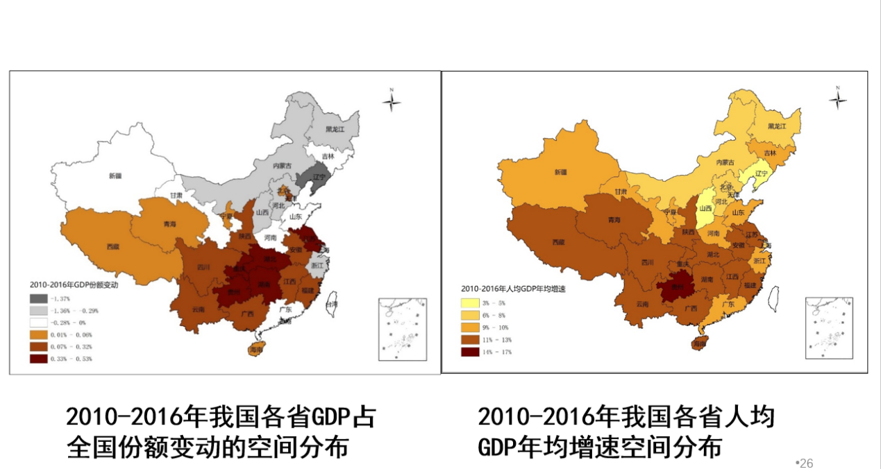 图示是2010年-2016年各省的GDP增速的变化。增加的部分基本是长江经济带,南部区域,东北减少比较多。在份额变动上,中部增加了、西部增加了,东北下降最多,东部略微下降。