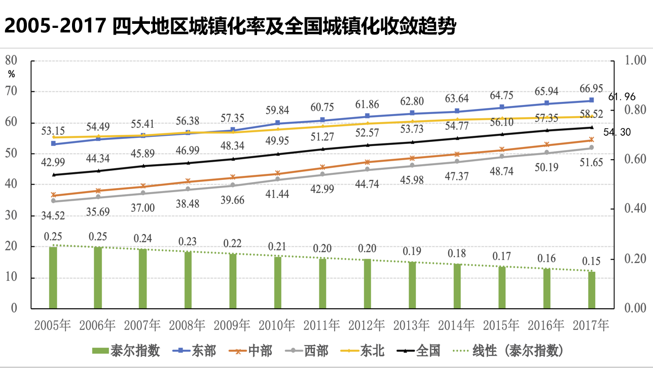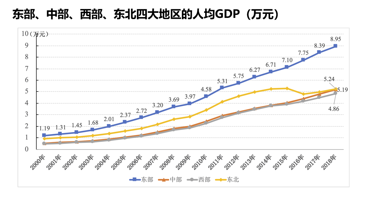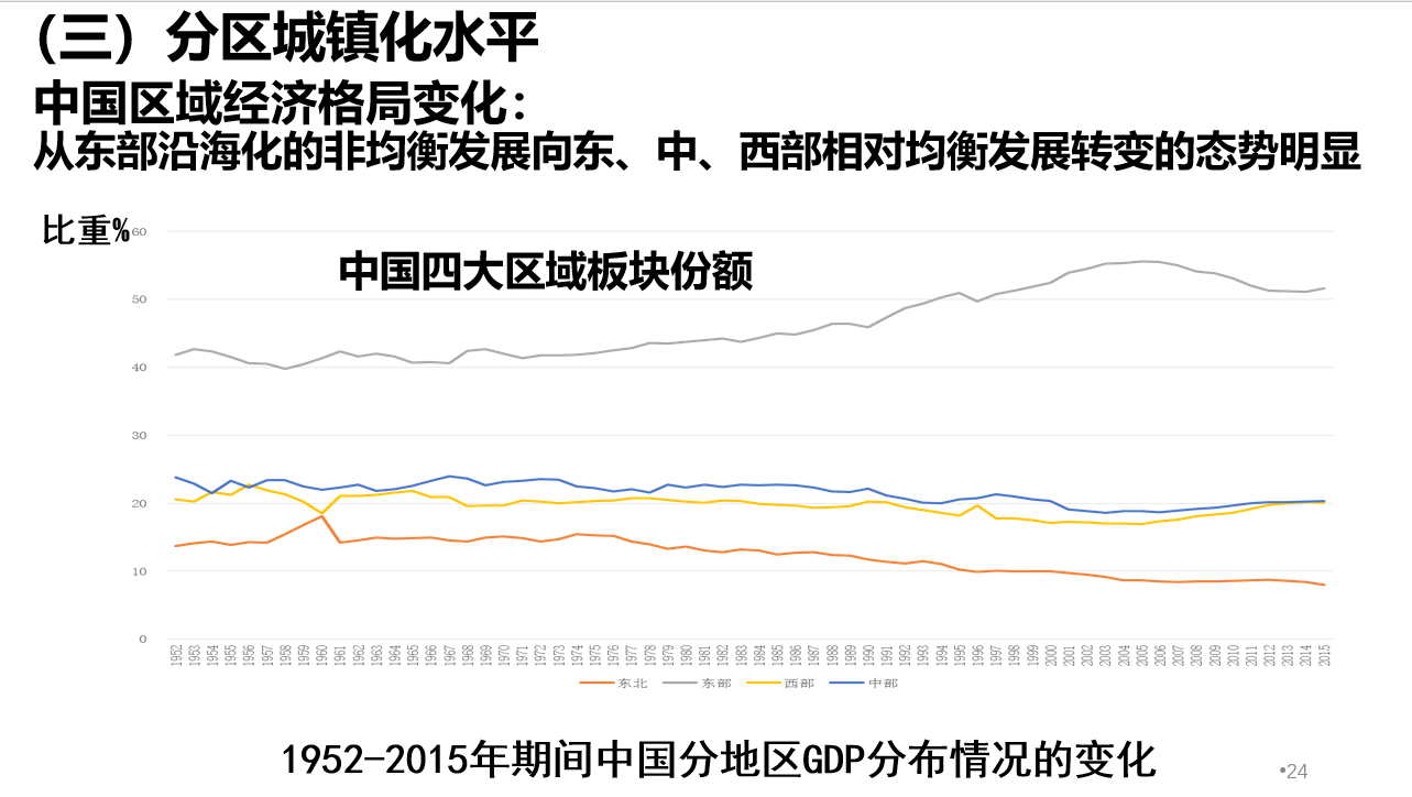 从人均GDP的变化来看,原来东北人均GDP是非常高的,现在变得跟其中部、西部差不多一样了。经济发展处于这个阶段,城镇化可能趋同。东部人均GDP水平还是一直领先,并且不断增加。
