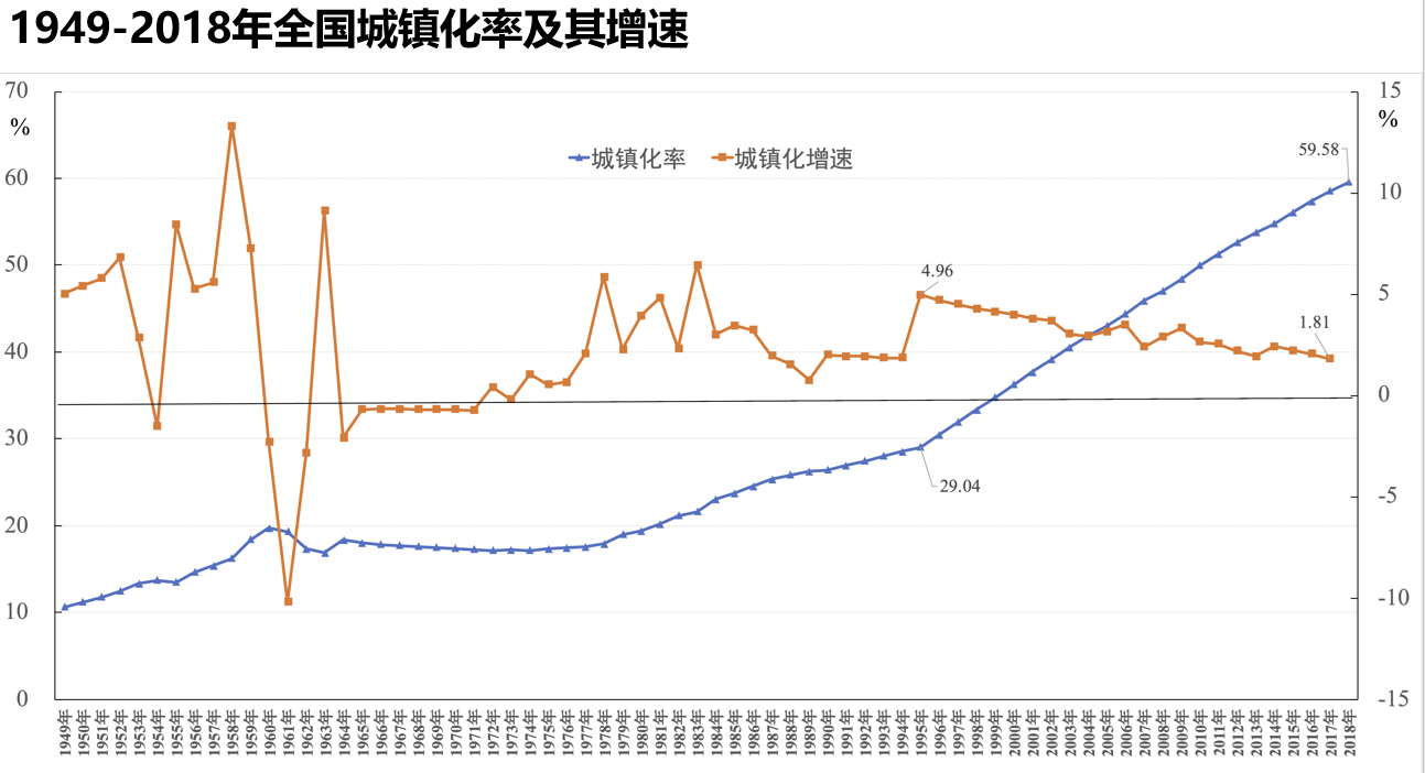 首先是改革开放以后的快速城市化。我国城镇化地增速基本在超过29%,增速迅速提升,2018年城镇化率达到了近60%, 从30%到60%期间的增速是非常快的。