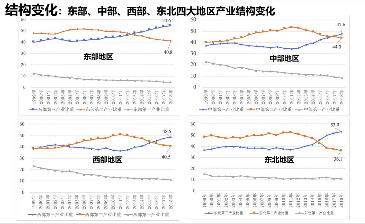从结构方面的变化看,东部地区在2013年左右,服务业超过了制造业,东北地区第二产业比重已经降到36%,东北工业的衰退和萎缩是一个很重要的结构性问题。