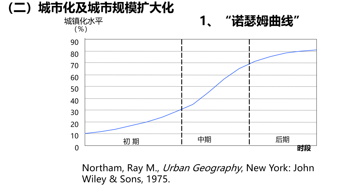 第一,城镇化发展具有一定规律,中国城镇发展实践体现了城镇化发展的一般规律,这里面讲到 “诺瑟烟曲线”、郊区化、多中心化与区域化、城市圈(群)在城市发展格局的地位上升。