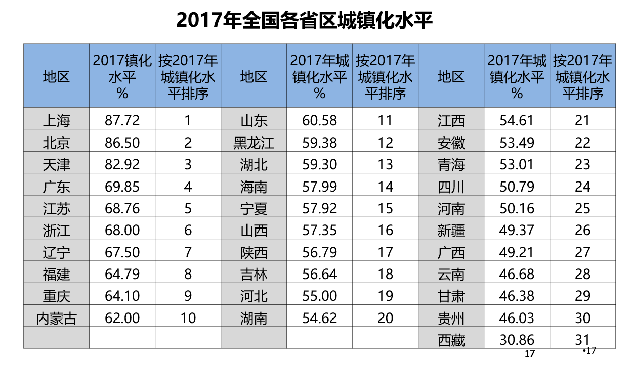 2017年全国内地31个省市区的城市化水平分布中,上海、北京、天津都超过了80%, 广东也接近70%,而西部、西南部的一些省份还低于50%。