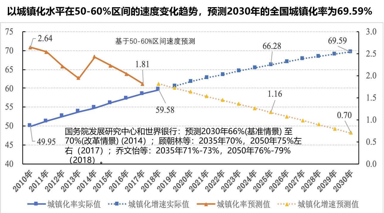 我们用1949年以后的中国城镇化发展曲线以及以50-60%区间速度预测未来城镇化率,其曲线近似诺瑟姆曲线,进而我们分析了中国城镇化近年来的增速,使用“指数平滑法”和“ARIMA”两种时间序列预测方法,预测结果均为城镇化率持续上升,“指数平滑法”预测结果在2025年城镇化率达到67.82%,“ARIMA”方法预测在2025年城镇化率增至65.64%,因此我们认为到2025年的城镇化应该是在66%这样的一个水平。2018年我们的城镇化率已经接近60%了,到2025年这7年左右的时间,再涨6%左右还是可能的。进一步,以城镇化水平在50-60%区间的速度变化趋势,到2030年,中国的城镇化率可以接近70%(69.59%)。到2050,我们估计中国的城镇化水平可以达到80%,往后有可能就稳定在这一水平上。